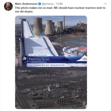 “这张照片让我很生气。我们也应该在滑雪场旁边建核反应堆。”在北京时间8日谷爱凌在首钢滑雪大跳台夺冠这天,美国网景通讯公司创始人马克·安德里森在媒体平台上发了大跳台的照片,还配了这样一句话。在评论区,很多网友在教育他的“无知”,而他随后发布了几张恶搞照片,不知道是不是为了化解尴尬。