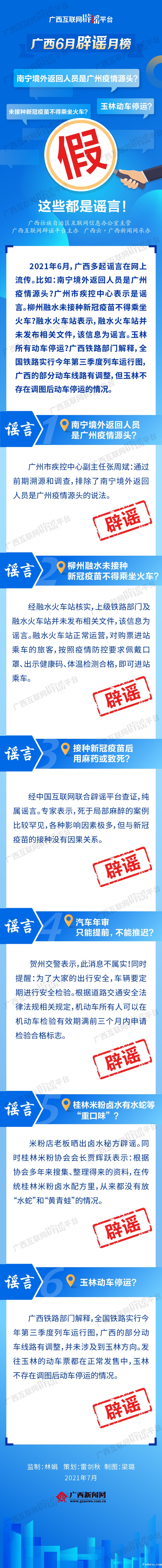 2021年6月,广西多起谣言在网上流传。比如:南宁境外返回人员是广州疫情源头?广州市疾控中心表示是谣言。柳州融水未接种新冠疫苗不得乘坐火车?融水火车站表示,融水火车站并未发布相关文件,该信息为谣言。玉林所有动车停运?广西铁路部门解释,全国铁路实行今年第三季度列车运行图,广西的部分动车线路有调整,但玉林不存在调图后动车停运的情况。必威app手机官方网站为您盘点6月广西辟谣信息,一起来了解真相。