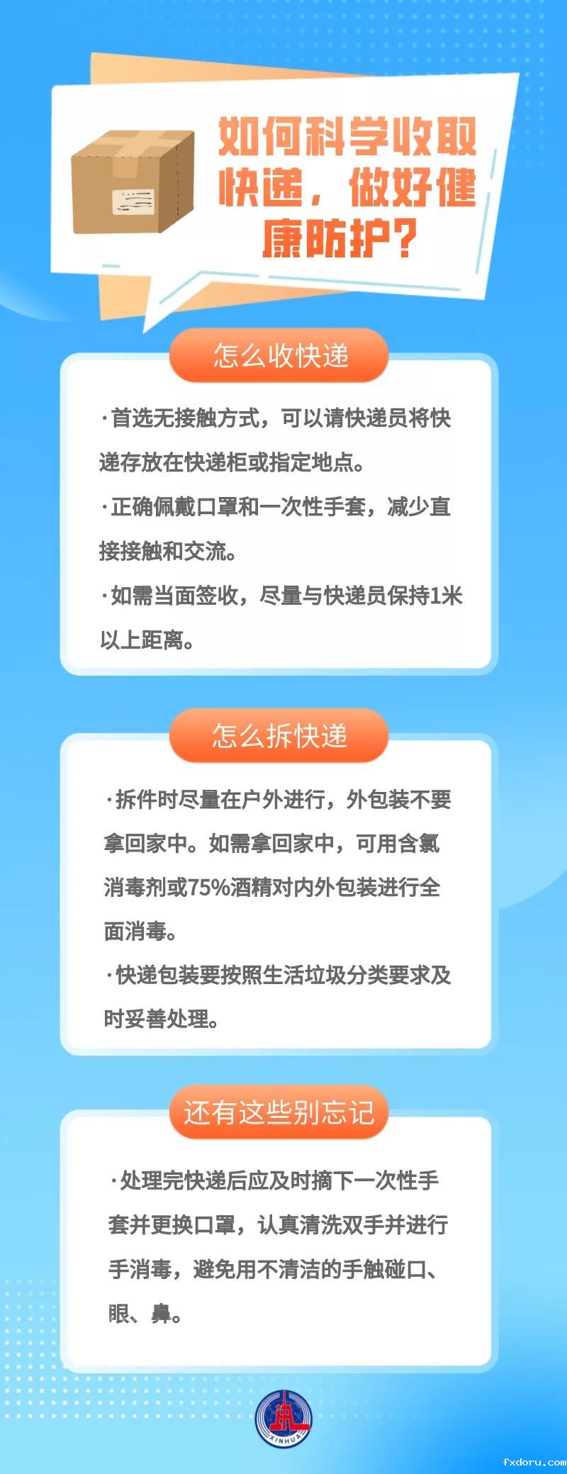 中国疾控中心消毒学首席专家张流波表示,收取快递最好选择无接触方式,或尽量佩戴好口罩和手套。拆除外包装后,及时摘下手套并清洁双手,做好手卫生。