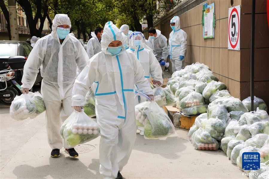 3月28日,上海市奉贤区西渡街道鸿宝一村(南区)的志愿者为居民送菜。新华社发(王燕婷 摄)