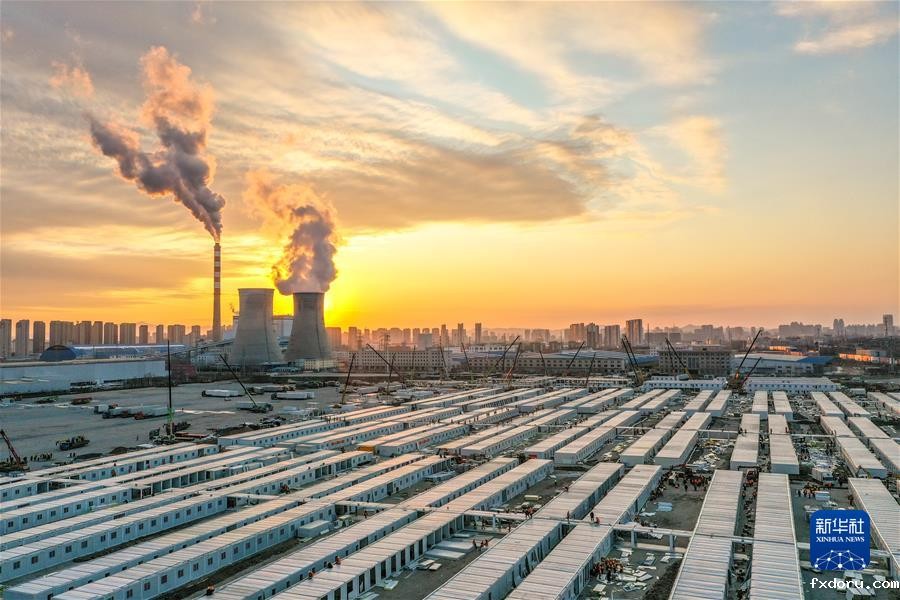 3月20日傍晚拍摄的吉林市高新南区隔离方舱建设现场(无人机照片)。 新华社记者 张楠 摄