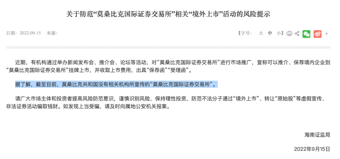 海南证监局、广西证监局等均已发布风险提示公告。其中,海南证监局称,据了解,截至目前,莫桑比克共和国没有相关机构所宣传的“莫桑比克国际证券交易所”。
