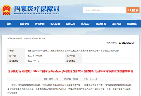 国家医疗保障局关于2022年国家医保药品目录调整通过形式审查的申报药品专家评审阶段性结果的公告
