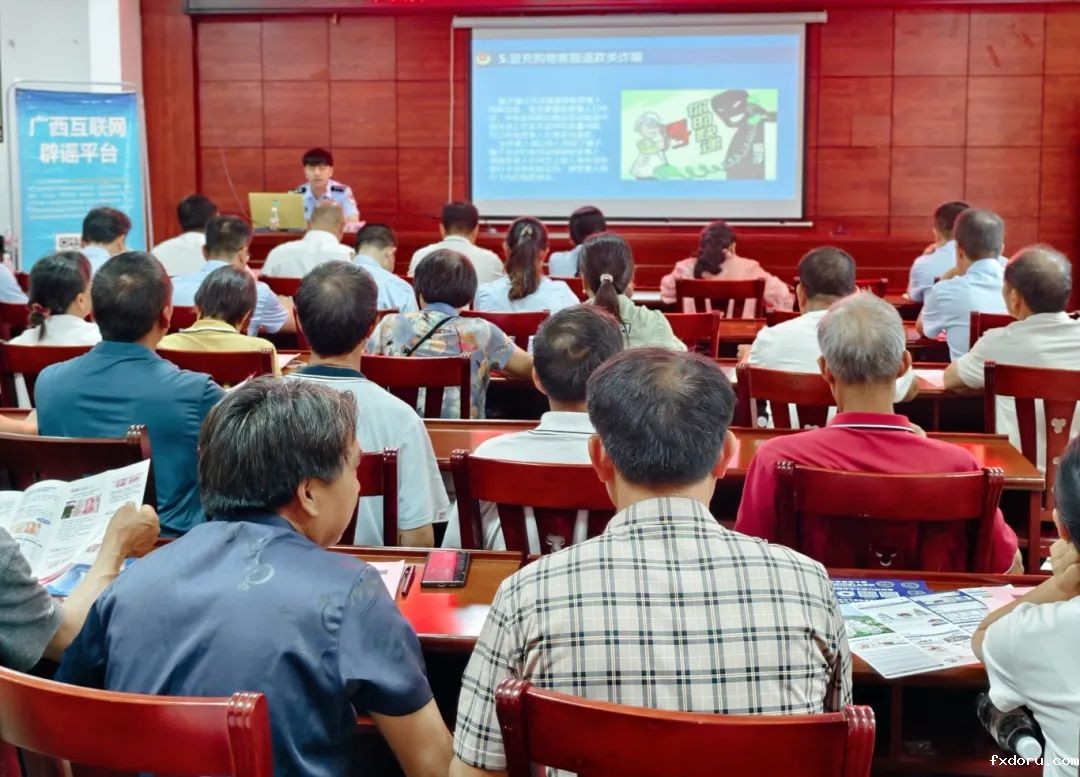 为进一步提升居民反诈防骗和网络谣言识别能力,6月19日,大新县委宣传部、县公安局、县互联网舆情中心、县农商行等多部门联合走进大新县桃城镇新兴社区开展“党建引领防诈骗·党员宣传强意识”主题宣传活动。通过“知识宣讲+有奖问答+趣味活动+走访入户”四位一体模式,切实提升党员干部和社区群众风险防范能力,活动吸引近100余名群众积极参与。