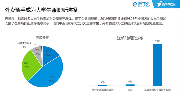 饿了么的报告指出,2019年暑期共计有9896名全国各地大学生新加入饿了么蜂鸟即配成为兼职骑手。在年级分布上,有1%是研究生及以上: