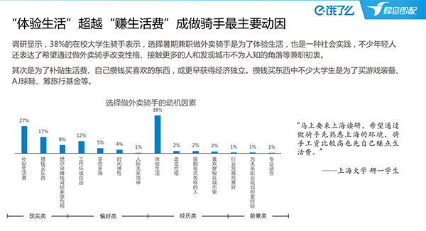 同时,报告也提及,这些大学生兼职做骑手,“体验生活”超越“赚生活费”成做骑手最主要的动因。