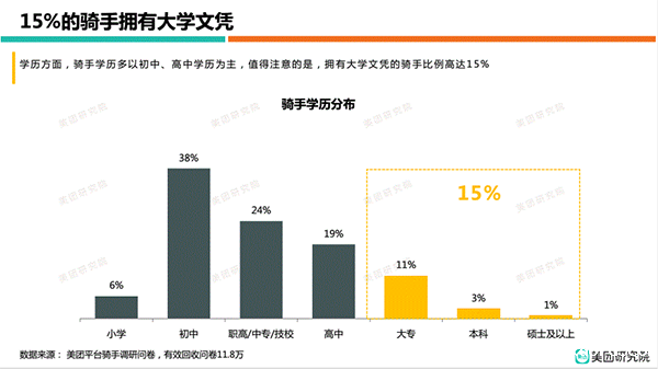 而美团报告的数据来源于美团平台骑手调研问卷,有效回收问卷11.8万,其中1%的人拥有硕士及以上文凭: