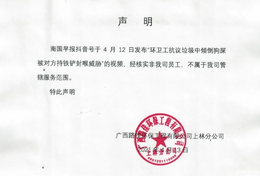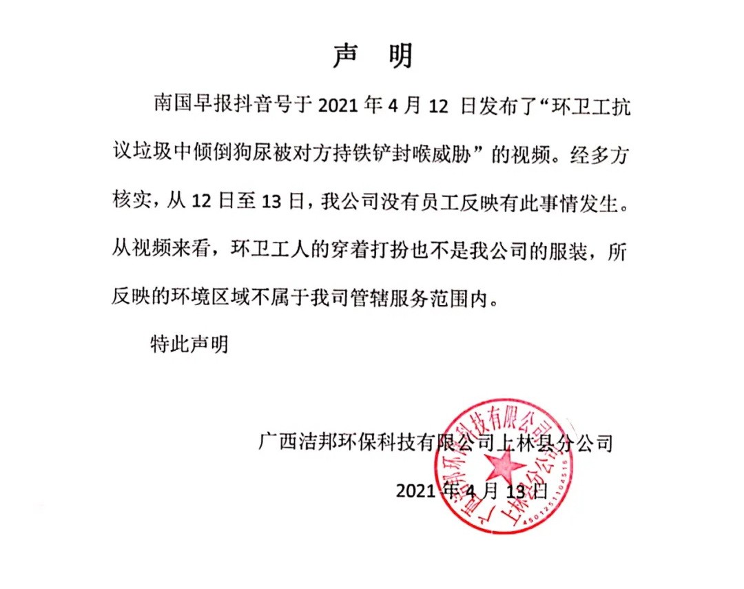 对此,上林县仅有的两家环卫公司发表声明,上述视频中的环卫工人并非“广西洁邦环保科技有限公司上林县分公司”及“广西路佳环保工程有限公司上林分公司”员工。