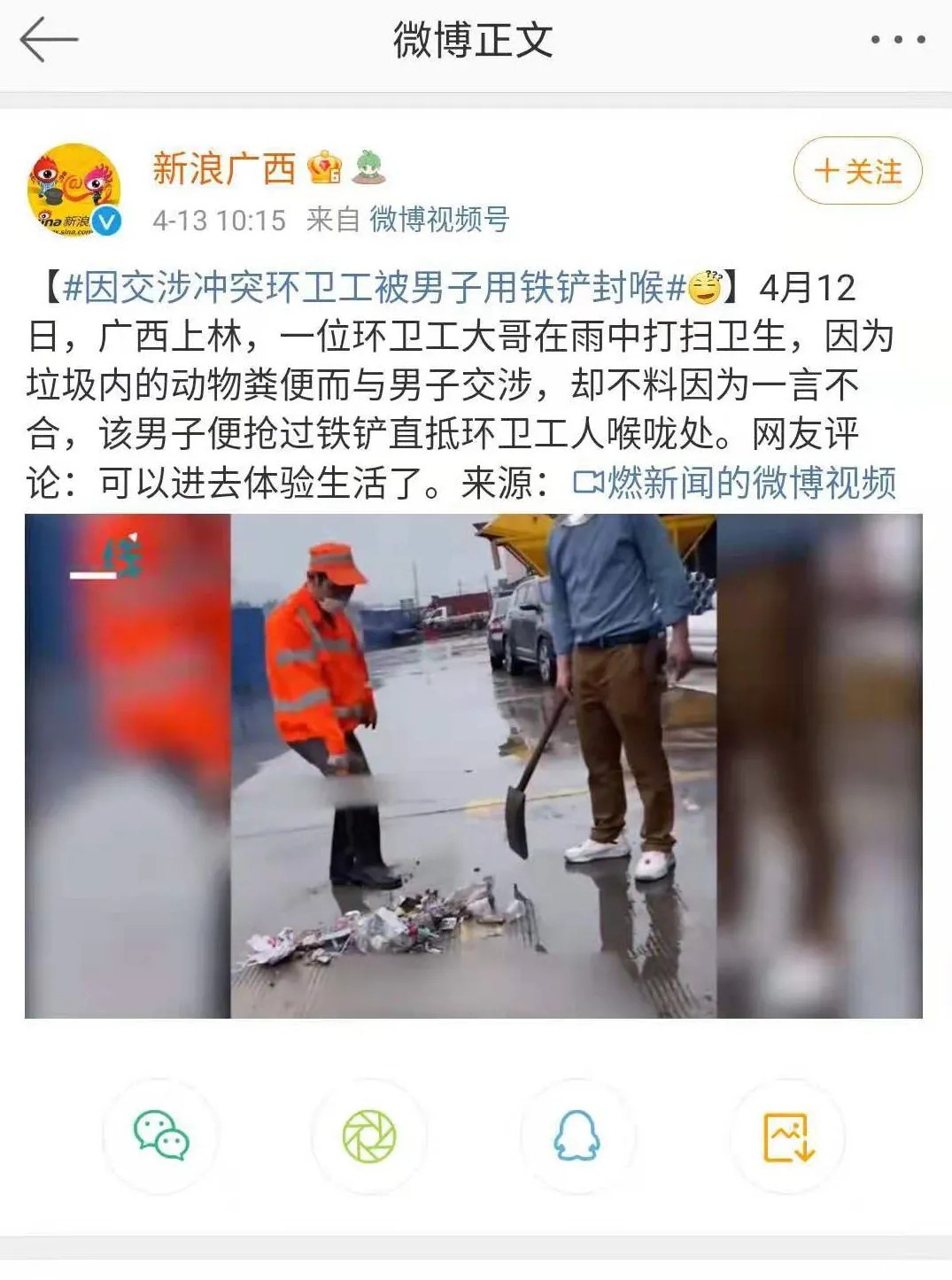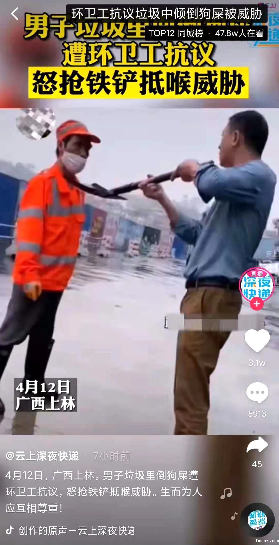 4月12日,一则“环卫工抗议垃圾中倾倒狗屎被铁铲抵喉威胁”的短视频在网络中流传,视频显示:环卫工人冒雨打扫卫生,因抗议垃圾中倾倒狗屎,被男子抢过铁铲抵喉威胁,并标注事发地为广西上林。