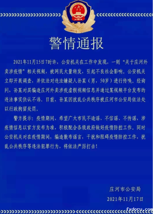 庄河市公安局于17日发布通报,该虚假信息系孙某发布。经传唤询问,孙某对其编造庄河外卖涉疫的虚假视频信息,并通过社交平台发布的违法事实供认不讳。