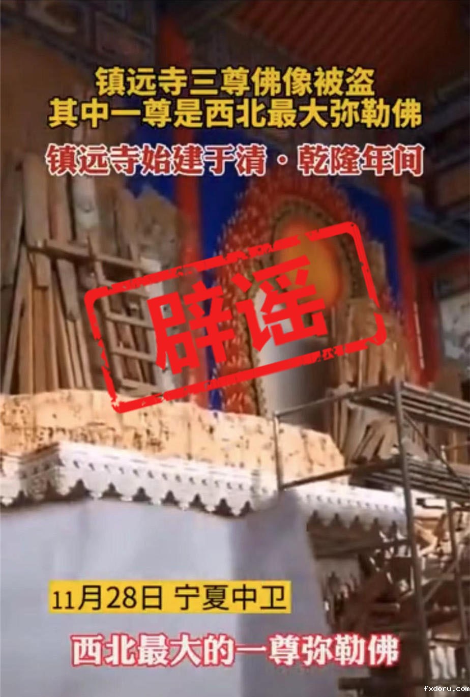 11月30日,有网友爆料称“宁夏中卫市镇远寺三尊佛像被盗”“其中一尊高七八米的佛像系西北最大的一尊弥勒佛”。经核实,以上消息不实。