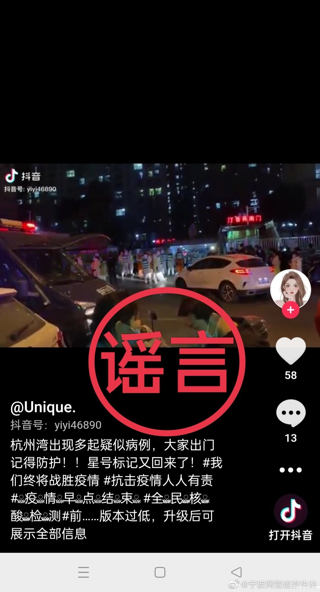 今天,抖音号上出现了关于杭州湾出现多起疑似病例的消息,经官方确认此为假消息。