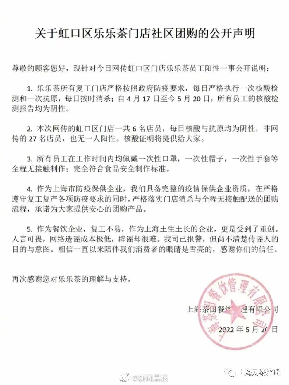 5月20日,针对上述传言,虹口区乐乐茶门店发布一则声明称,所有复工门店严格按照政府防疫要求,每日严格执行一次核酸检测和一次抗原,每日按时消杀;自4月17日至今5月20日,所有员工的核酸检测报告均为阴性。本次网传的虹口区门店一共6名店员,每日核酸与抗原均为阴性。门店附上了所有员工的核酸证明截图。声明中还提到,作为上海市防疫保供企业,乐乐茶具备完整的疫情保供企业资质,在严格遵守复工复产各项防疫要求的同时严格落实门店消杀与全程无接触配送的团购流程,承诺为大家提供安心的团购产品。