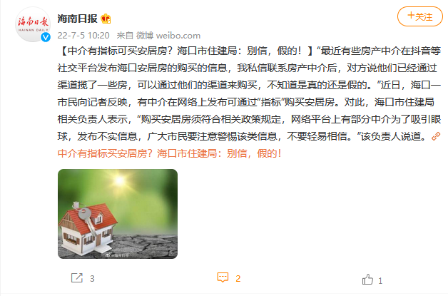 “最近有些房产中介在抖音等社交平台发布海口安居房的购买的信息,我私信联系房产中介后,对方说他们已经通过渠道揽了一些房,可以通过他们的渠道来购买,不知道是真的还是假的。”近日,海口一市民向新海南客户端记者反映,有中介在网络上发布可以通过“指标”购买安居房,希望媒体关注,避免市民上当受骗。