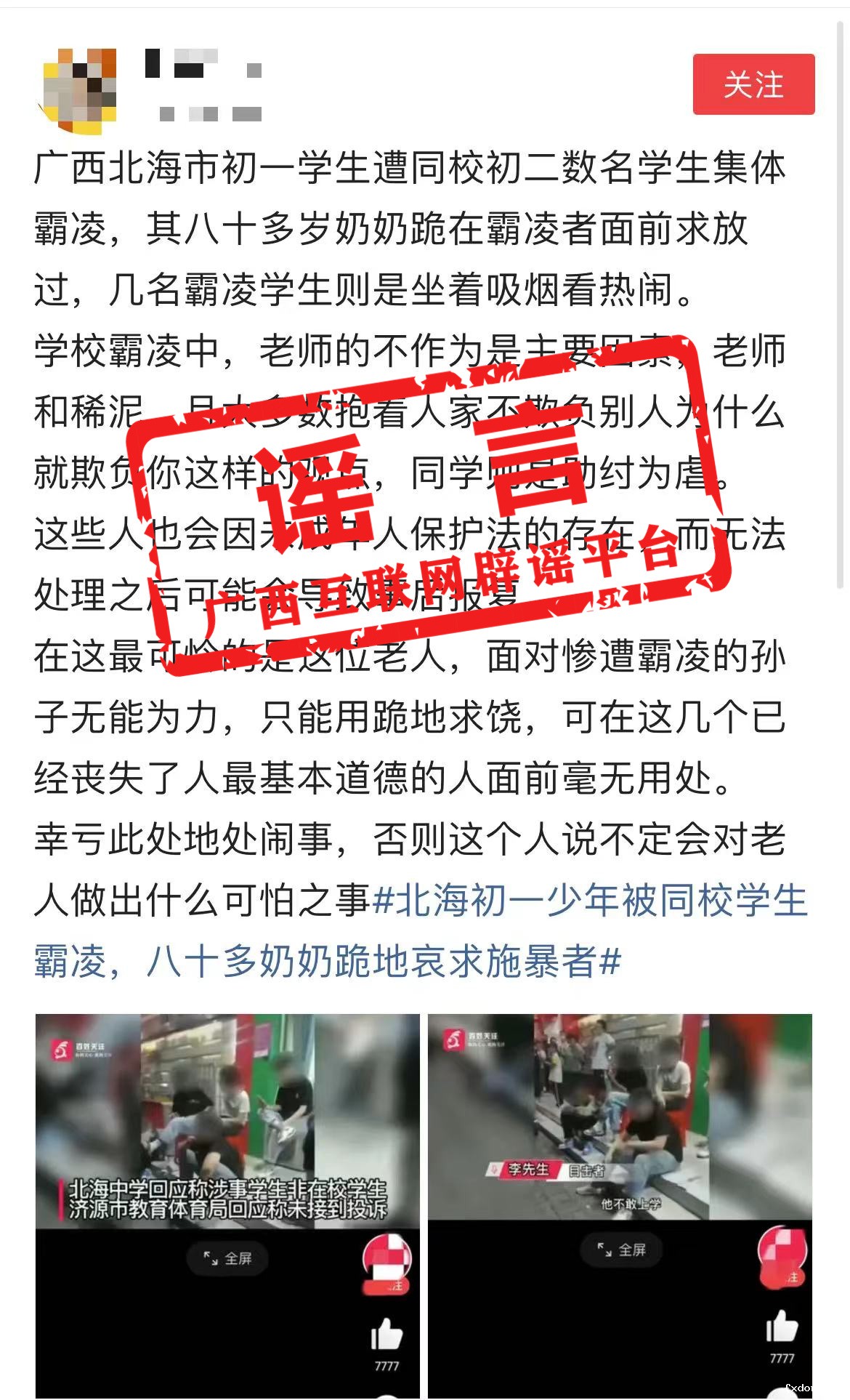 近日,一则“广西北海市初一学生遭同校数名学生集体霸凌,其八十多岁奶奶跪在霸凌者面前求放过,几名霸凌学生坐着吸烟看热闹”的消息在社交媒体上传播。