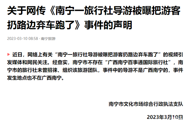 3月10日, 南宁市文化市场综合行政执法支队发布声明。经执法支队查实,南宁市不存在“广西南宁百事通国际旅行社”,南宁市的旅行社也未曾招徕、组织该旅游团队,事件中的导游不属于广西南宁,网传事件发生地点也不是广西南宁。