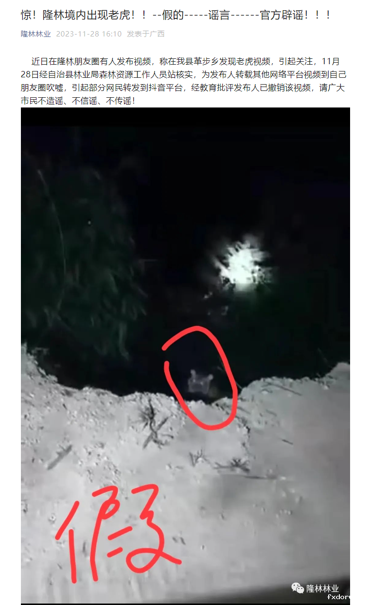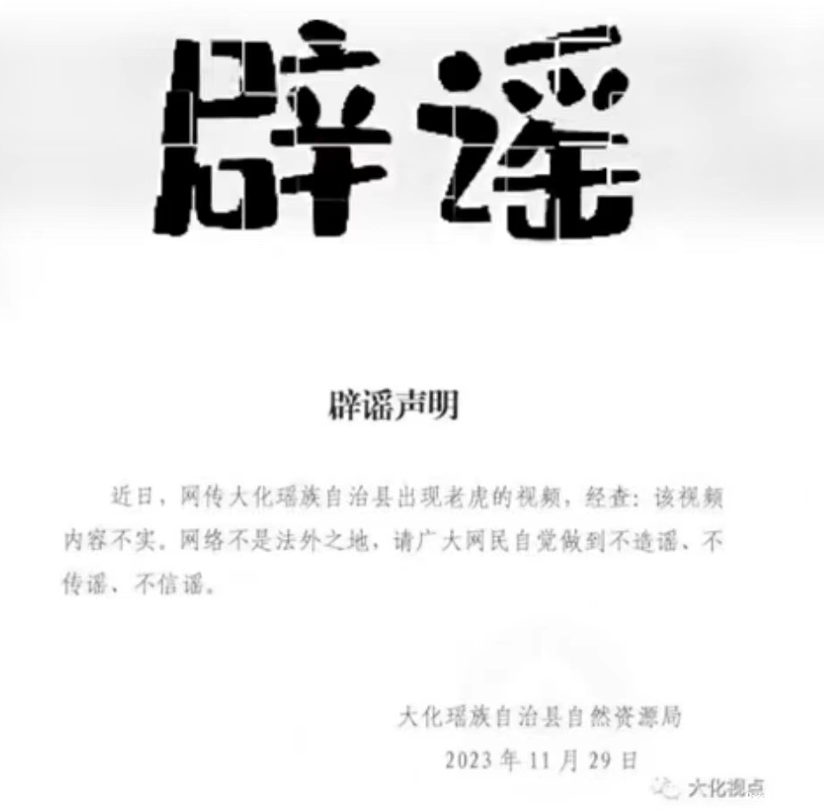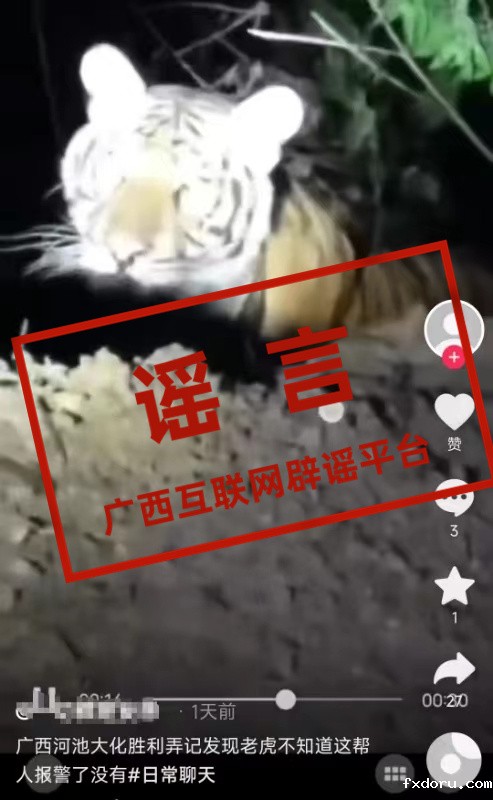 同样一段视频,有网民称是河池大化县发现了老虎。对此,大化县自然资源局及时发布辟谣声明,称网传信息不实。